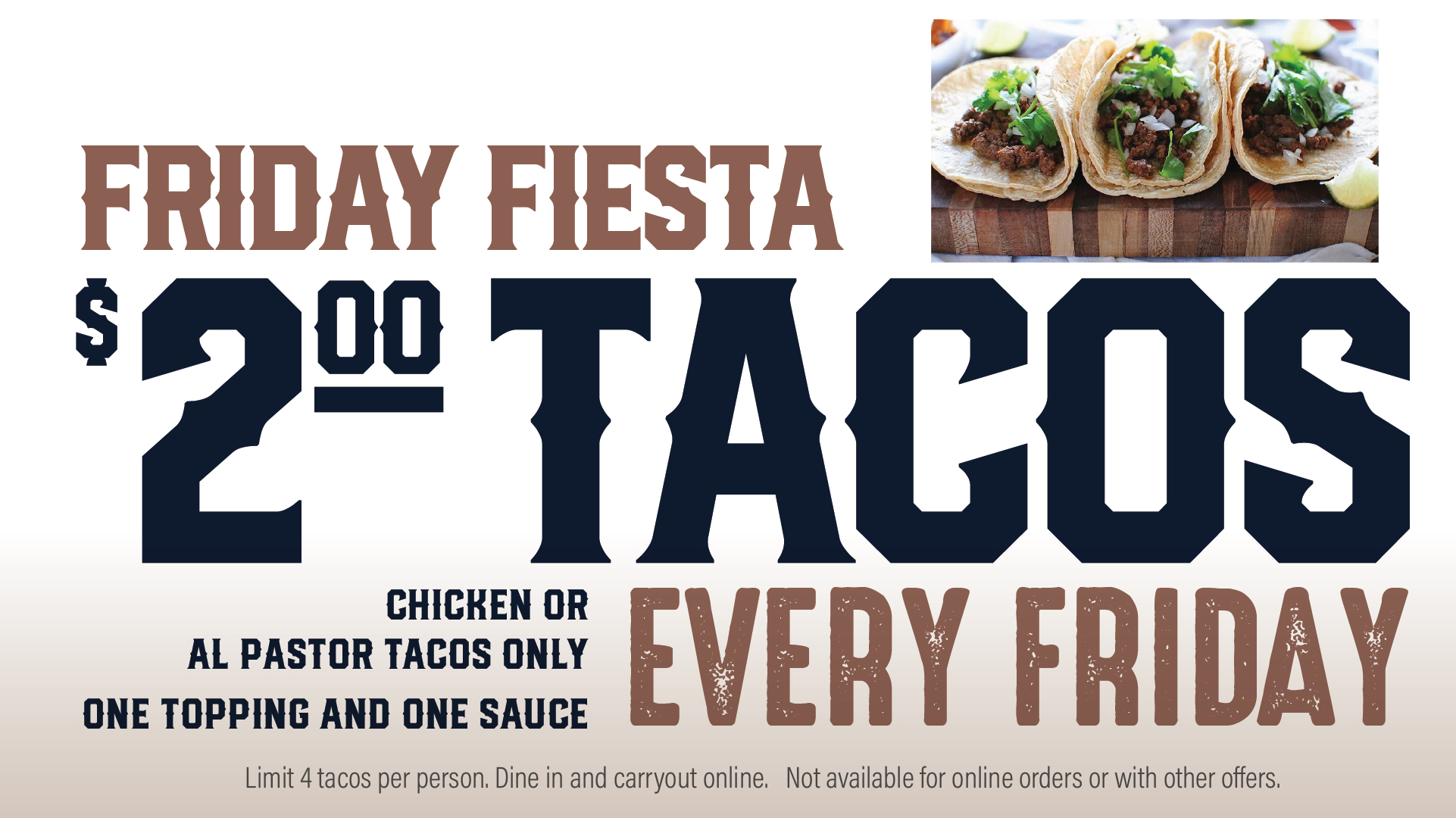 Friday Fiesta- $2 Tacos. Huntsville, AL only.